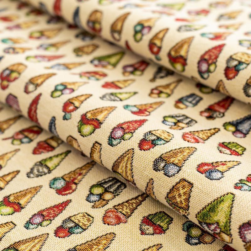 Гобелен представляет собой ткань, выполненную  перекрестным плетением нитей с одномоментным созданием сюжетной или орнаментальной композиции. Это плотный материал высокую прочность и износостойкость. Гобелен используют для пошива плотных светонепроницаемых штор, декоративного домашнего текстиля и аксессуаров, в мебельном производстве для обивки мебели. Так же применяется в рукоделии: модные кошельки, сумочки, пояса и другие аксессуары и при изготовлении дизайнерской одежды. На спокойном песочно-бежевом фоне цветное разнообразие рожков и корзиночек с мороженым.