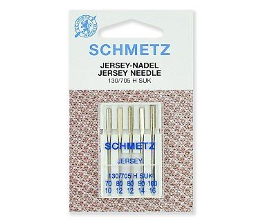 Для бытовых швейных машин и оверлоков. Иглы джерси имеют закругленное острие большого диаметра, что позволяет прошивать трикотажное полотно, не нарушая его структуру. Стандарт: 130/705H SUK.