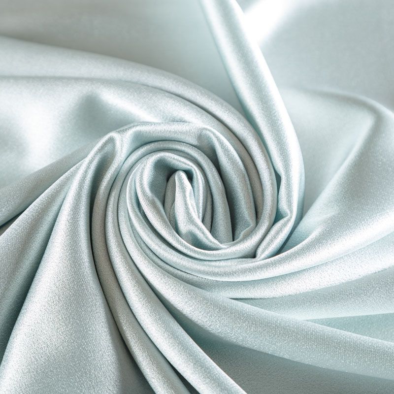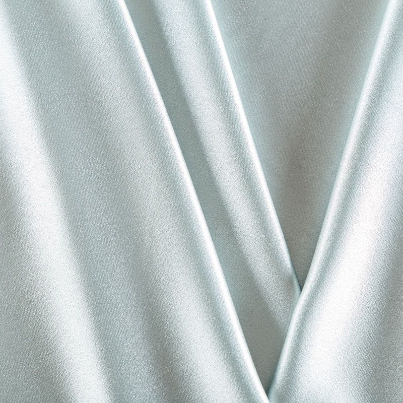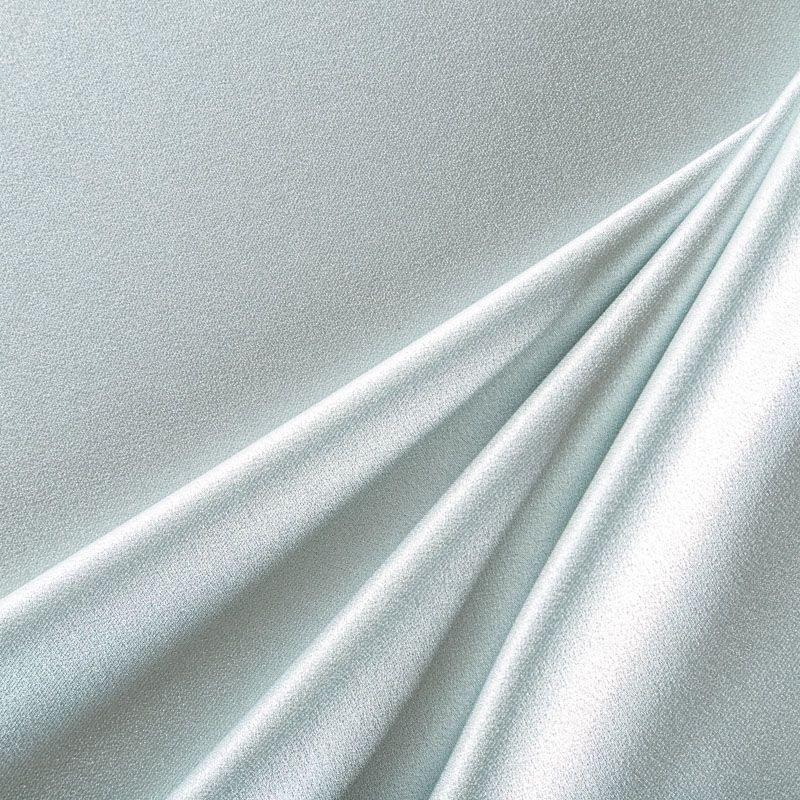 Итальянская ткань кади мятного оттенка. Кади — это креп-атлас с красивым глянцевым блеском. Ткань с плотной фактурой, роскошно ниспадает, очень хорошо тянется, изумительно садится по фигуре и шикарно смотрится в изделии. Она хорошо драпируется, эффектно облегает. Подходит для пошива удлиненных платьев с драпировками, платья-футляра, брюк палаццо, юбки-карандаш, жакета, туники, кроп-топа, а также для вечерних, свадебных и  выпускных платьев и костюмов.