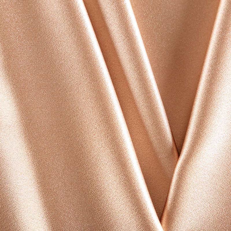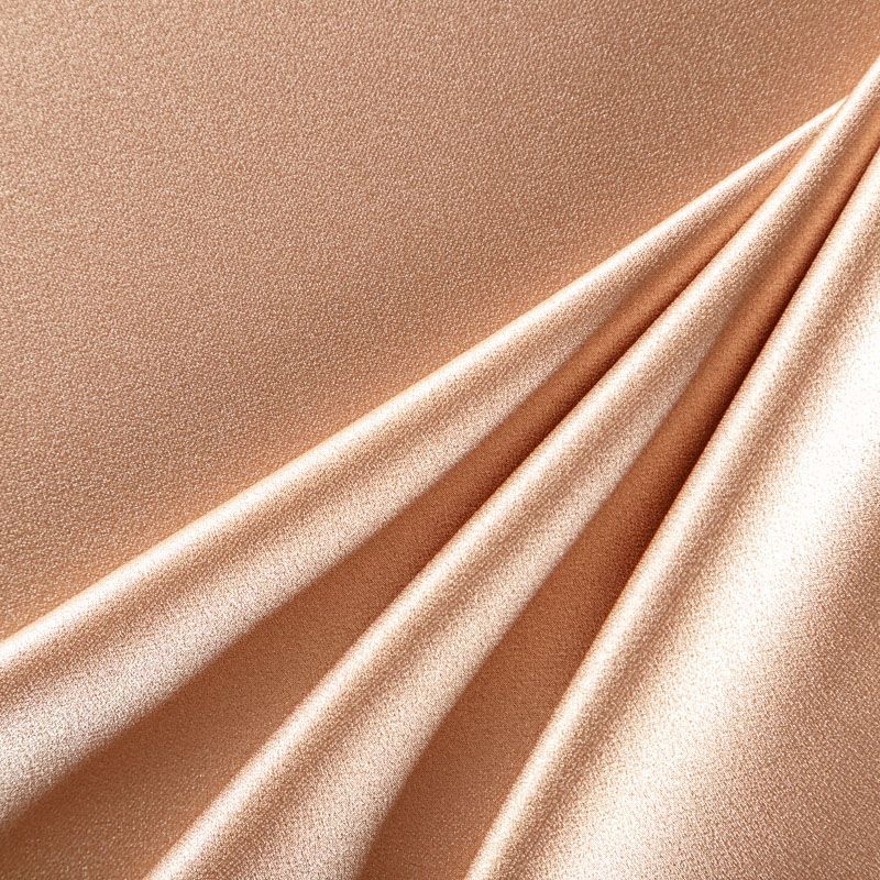 Итальянская ткань кади светло-коричневого оттенка. Кади — это креп-атлас с красивым глянцевым блеском. Ткань с плотной фактурой, роскошно ниспадает, очень хорошо тянется, изумительно садится по фигуре и шикарно смотрится в изделии. Она хорошо драпируется, эффектно облегает. Подходит для пошива удлиненных платьев с драпировками, платья-футляра, брюк палаццо, юбки-карандаш, жакета, туники, кроп-топа, а также для вечерних, свадебных и выпускных платьев и костюмов.