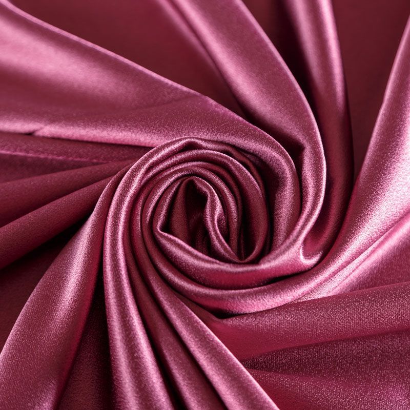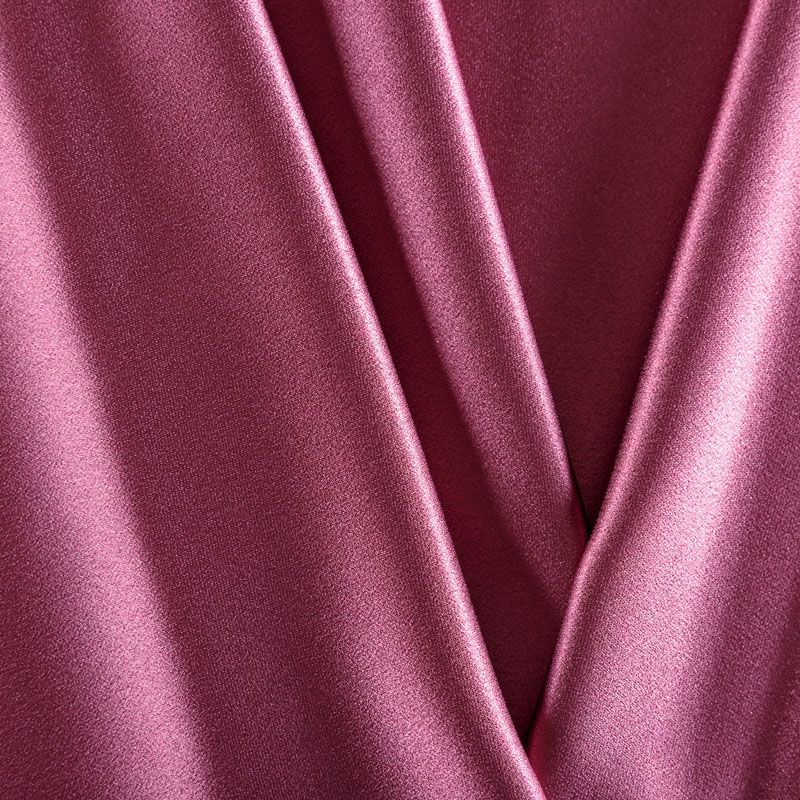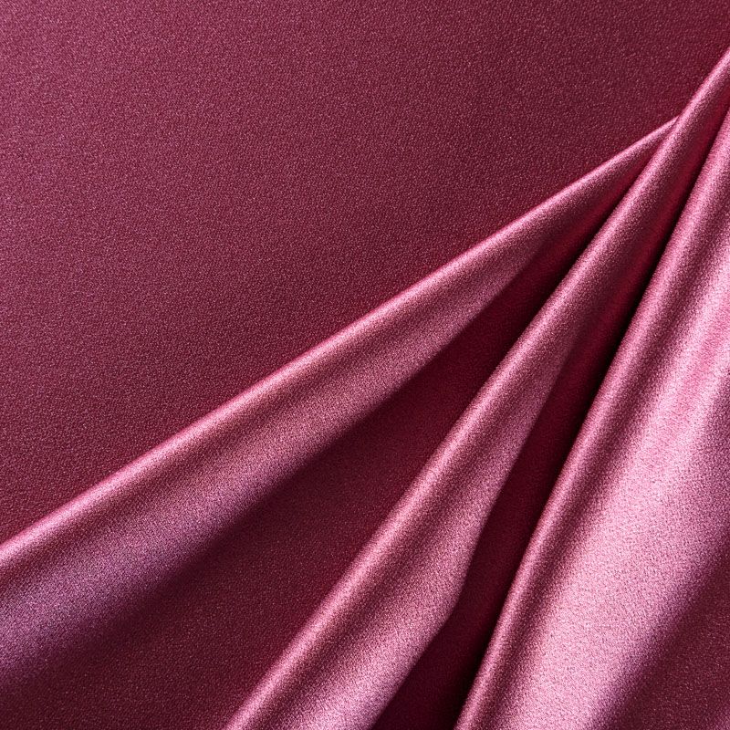 Итальянская ткань кади ягодного оттенка. Кади — это креп-атлас с красивым глянцевым блеском. Ткань с плотной фактурой, роскошно ниспадает, очень хорошо тянется, изумительно садится по фигуре и шикарно смотрится в изделии. Она хорошо драпируется, эффектно облегает. Подходит для пошива удлиненных платьев с драпировками, платья-футляра, брюк палаццо, юбки-карандаш, жакета, туники, кроп-топа, а также для вечерних, свадебных и  выпускных платьев и костюмов.