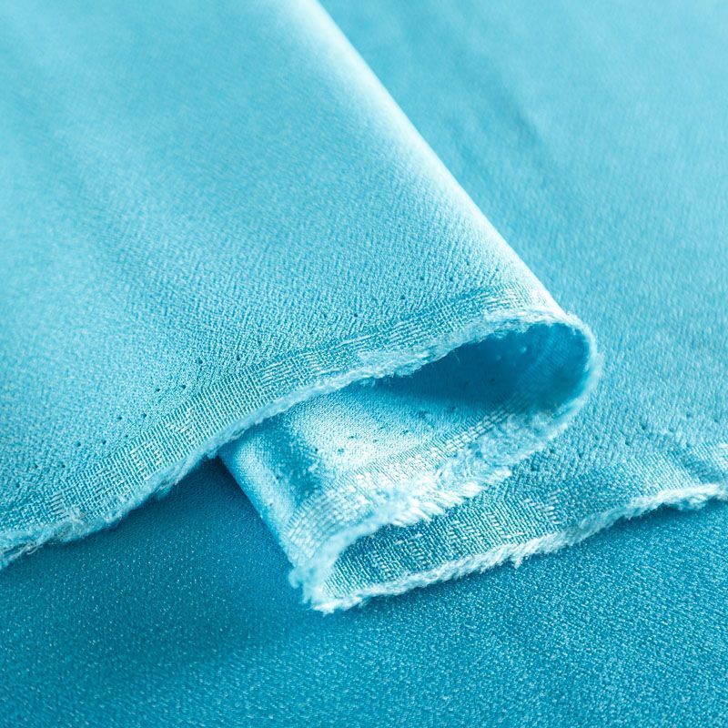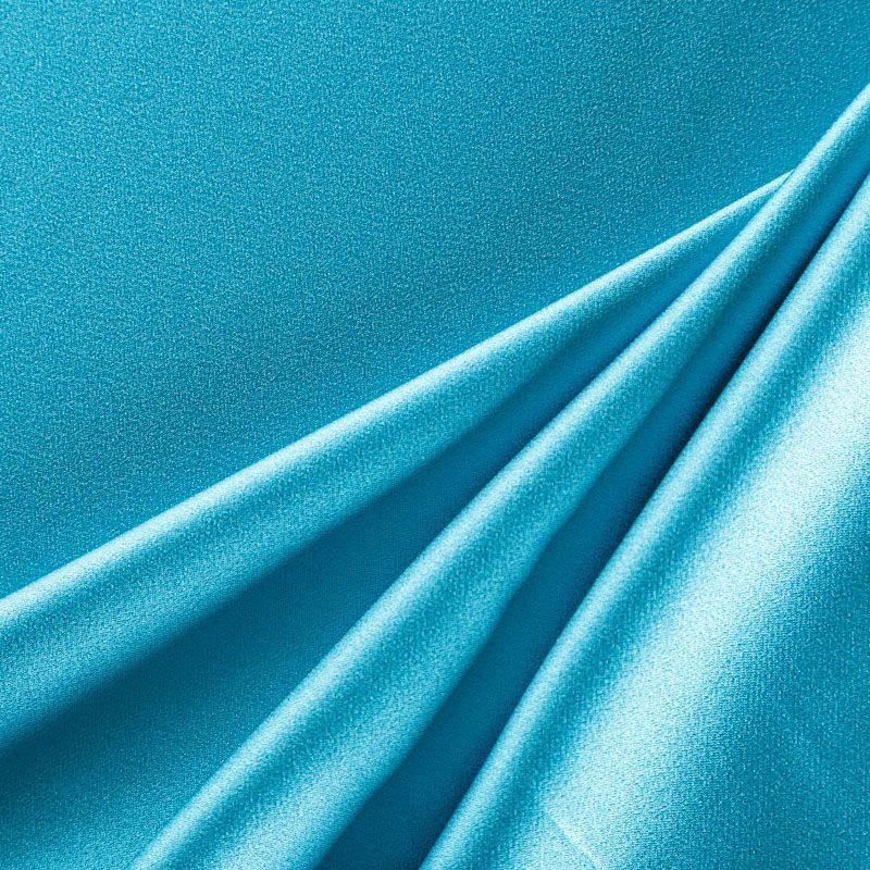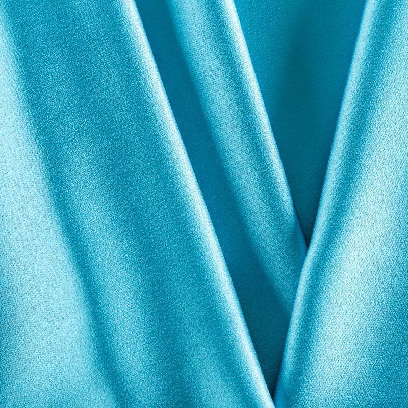 Итальянская ткань кади сине-зеленого оттенка. Кади — это креп-атлас с красивым глянцевым блеском. Ткань с плотной фактурой, роскошно ниспадает, очень хорошо тянется, изумительно садится по фигуре и шикарно смотрится в изделии. Она хорошо драпируется, эффектно облегает. Подходит для пошива удлиненных платьев с драпировками, платья-футляра, брюк палаццо, юбки-карандаш, жакета, туники, кроп-топа, а также для вечерних, свадебных и  выпускных платьев и костюмов.