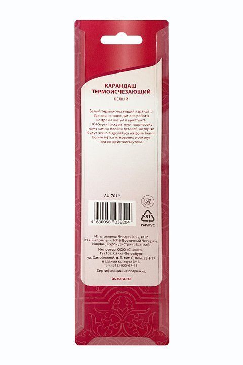 Белый термоисчезающий карандаш. Идеально подходит для работы во время шитья и квилтинга. Обеспечит аккуратную прорисовку даже самых мелких деталей, которые будут четко выделяться на фоне ткани. Белые метки мгновенно исчезнут под воздействием утюга.