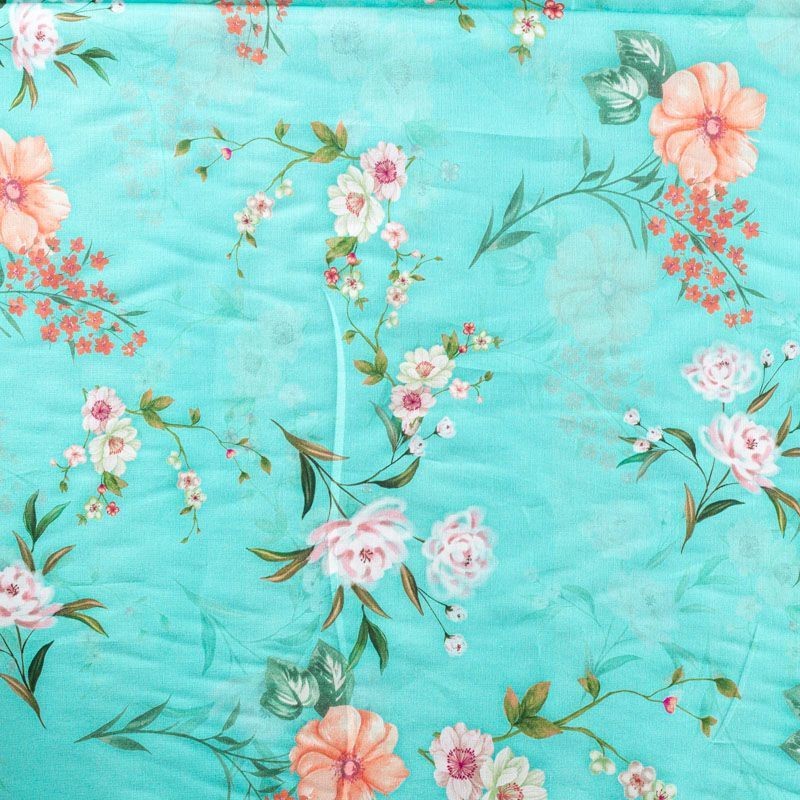 Плательно-рубашечный хлопок бирюзового оттенка с элегантным цветочным принтом. Ткань очень лёгкая, воздушная, тонкая, похожа на батист, немного прозрачная, поверхность матовая, гладкая, приятная к телу, хорошо драпируется. Прекрасно подойдет блузы, платья-рубашки, летнего сарафана, туники.