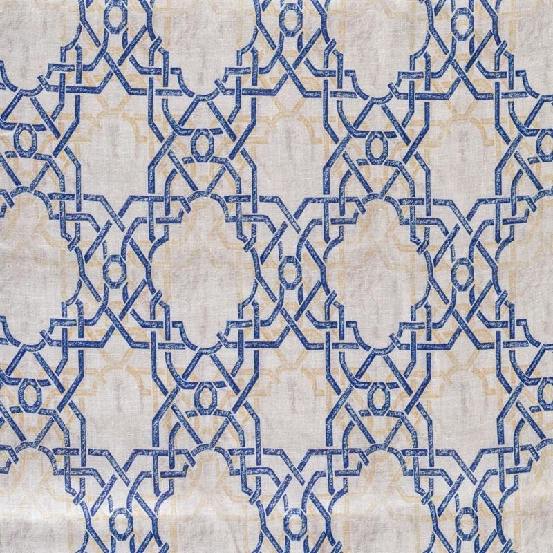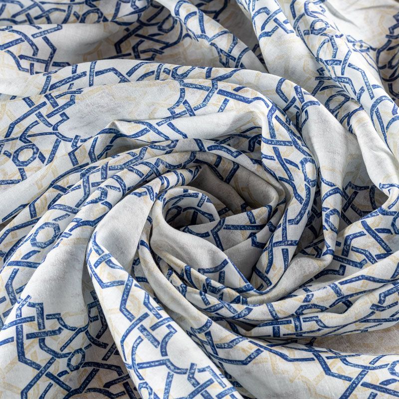 Плательно-блузочная ткань из натурального хлопка с крупным марокканским узором-решеткой в синих и бежевых цветах на молочном фоне. Ткань легкая, тонкая, хорошо "дышит", мягкая, слегка прозрачная, по плотности напоминает батист. Подойдет для пошива летнего платья, летящей юбки, блузы, сарафана или рубашки.