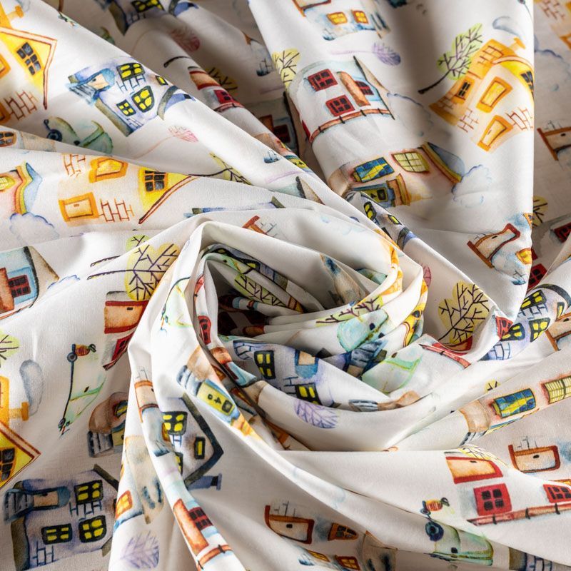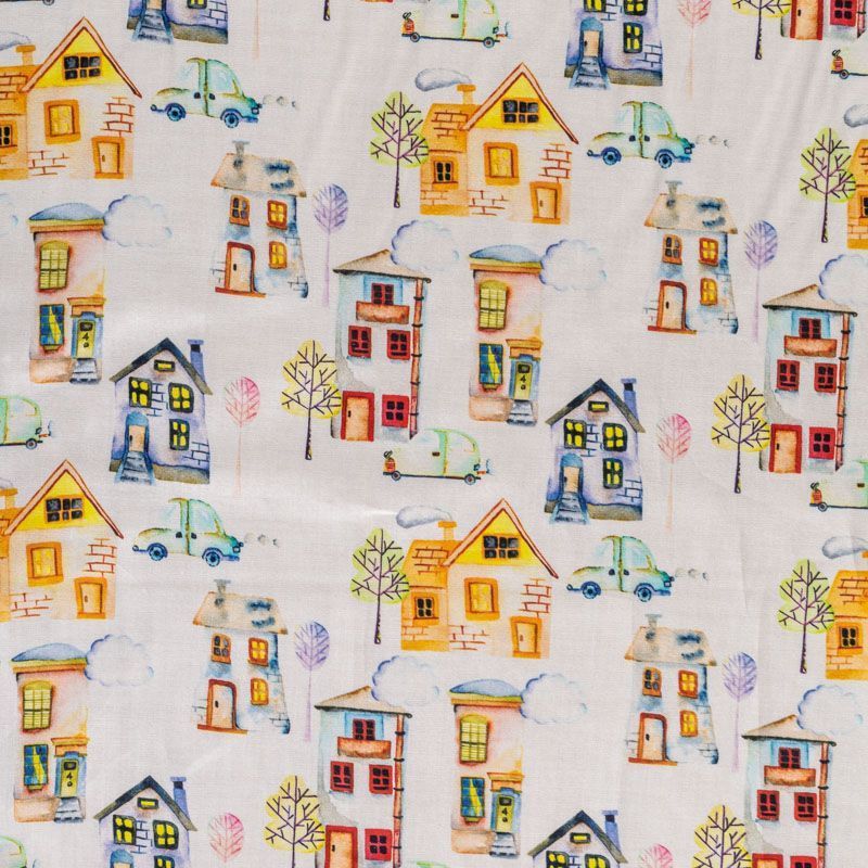Итальянский натуральный хлопок с детским городским рисунком в пастельных тонах. Ткань легкая, тонкая, хорошо "дышит", мягкая, слегка прозрачная, по плотности напоминает батист. Подойдет для пошива домашней одежды, детских летних платьев, песочников, юбки, сарафана или рубашки, а также для для пошива постельных принадлежностей, подушек, покрывал, скрапбукинга, корзин и других видов творчества.