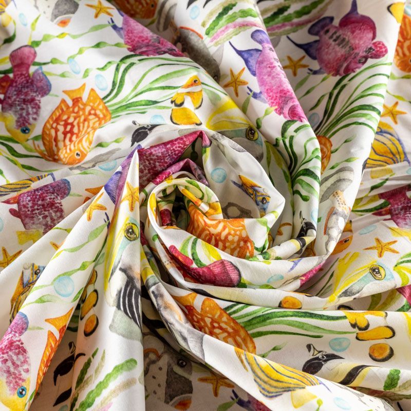 Итальянский натуральный хлопок с ярким принтом в виде морских обитателей. Ткань легкая, тонкая, хорошо "дышит", мягкая, слегка прозрачная, по плотности напоминает батист. Подойдет для пошива домашней одежды, детских летних платьев, песочников, юбки, сарафана или рубашки, а также для для пошива постельных принадлежностей, подушек, покрывал, скрапбукинга, корзин и других видов творчества.