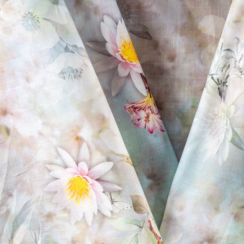 Плательно-блузочная ткань из натурального хлопка с крупным расттительным принтом в пастельных тонах на серо-зеленом фоне. Ткань легкая, тонкая, хорошо "дышит", мягкая, слегка прозрачная, по плотности напоминает батист. Подойдет для пошива летнего платья, летящей юбки, блузы, сарафана или рубашки.