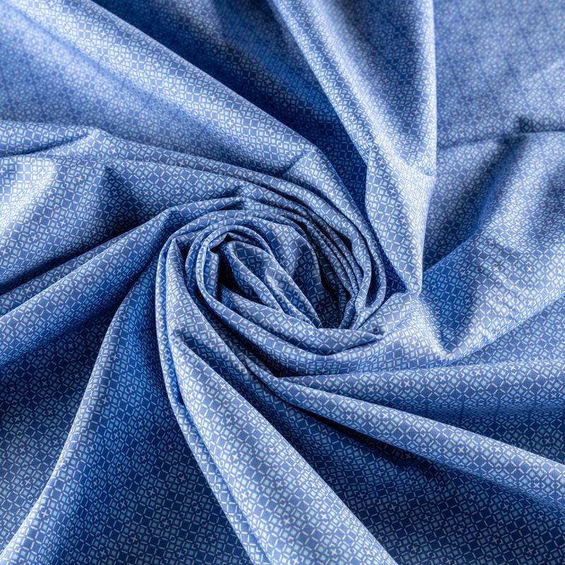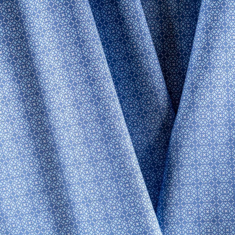 На синем фоне мелкий абстрактный рисунок в восточном стиле белого цвета.