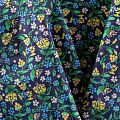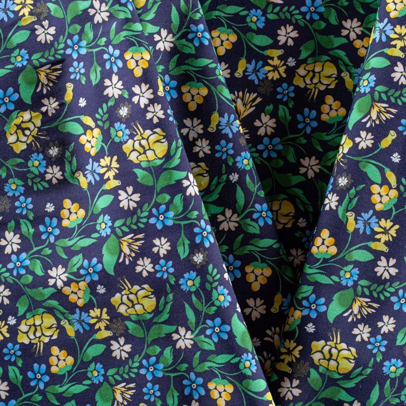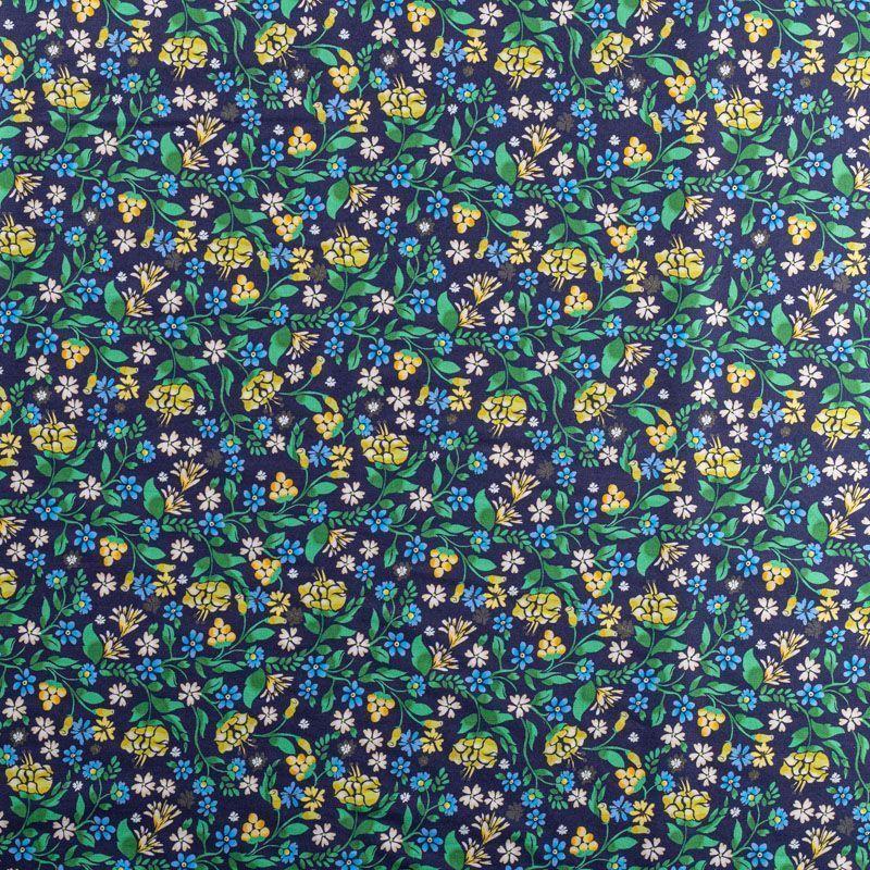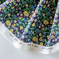 Плательно-рубашечный натуральный хлопок от французского дизайнера с мелким цветочным узором в желтых и зеленых тонах на темно-синем фоне. Ткань имеет плотное переплетение, матовую гладкую поверхность, хорошо держит форму, не прозрачная. Подойдет для пошива рубашек, платья-рубашки, юбки, сарафана, туники, домашней одежды.