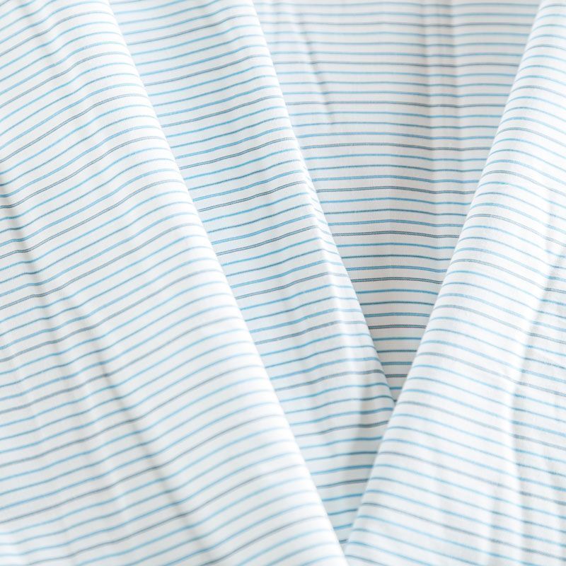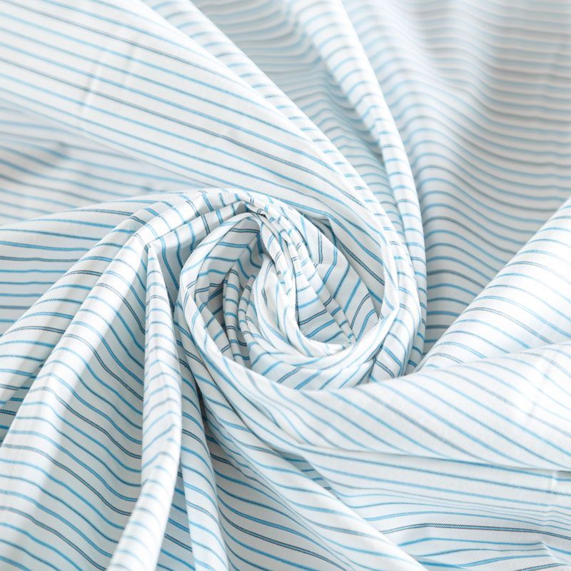 Плательно-рубашечный хлопок в белого цвета в голубую полоску. Ткань мягкая, лёгкая, непрозрачная, пластичная и приятная к телу, хорошо драпируется, имеет гладкую матовую поверхность и сатиновое плетение. Прекрасно подойдет как для пошива платья-рубашки, сарафана, платьев различных фасонов, туники, топа, летнего костюма, комбинезона, мужкой и детской одежды.