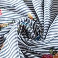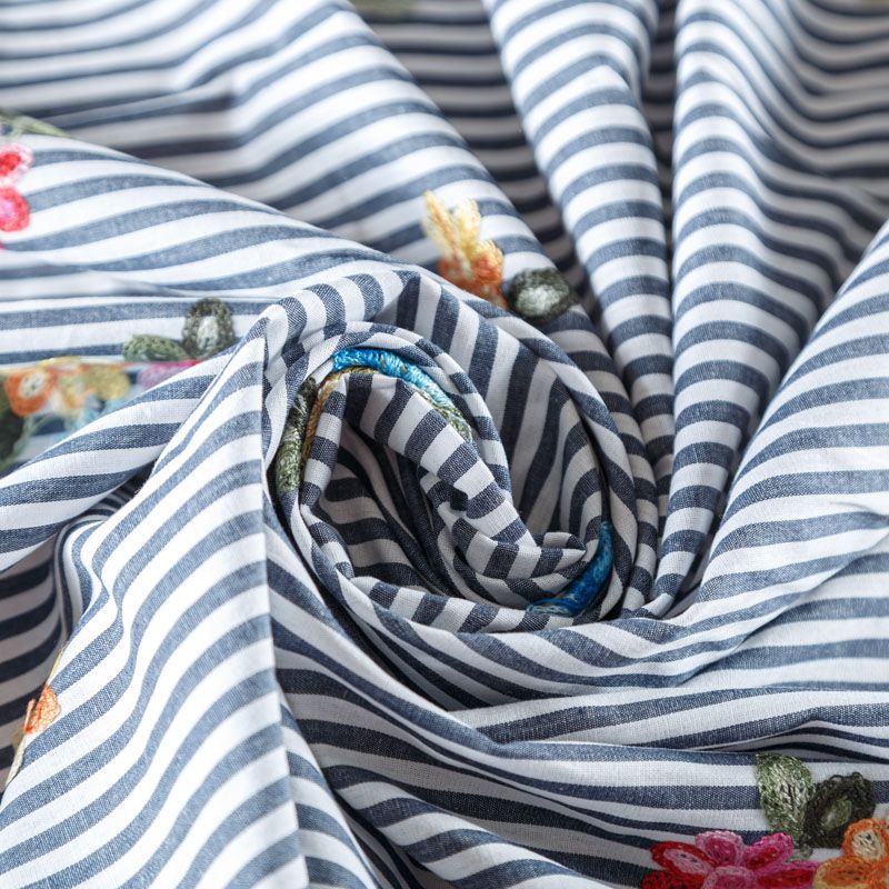 Плательно-блузочный хлопок белого цвета в серо-голубую полоску декорирован яркой цветочной вышивкой. Полотно средней плотности, слегка просвечивает, очень нежное и пластичное, держит форму. Материал отлично драпируется, формируя мягкие складки. Подойдет для прямых, полуприлегающих, расклешенных моделей платьев, сарафанов, а также юбки, туники, платье-рубашки.