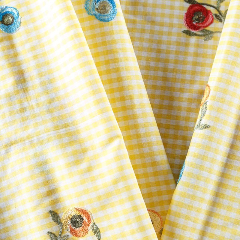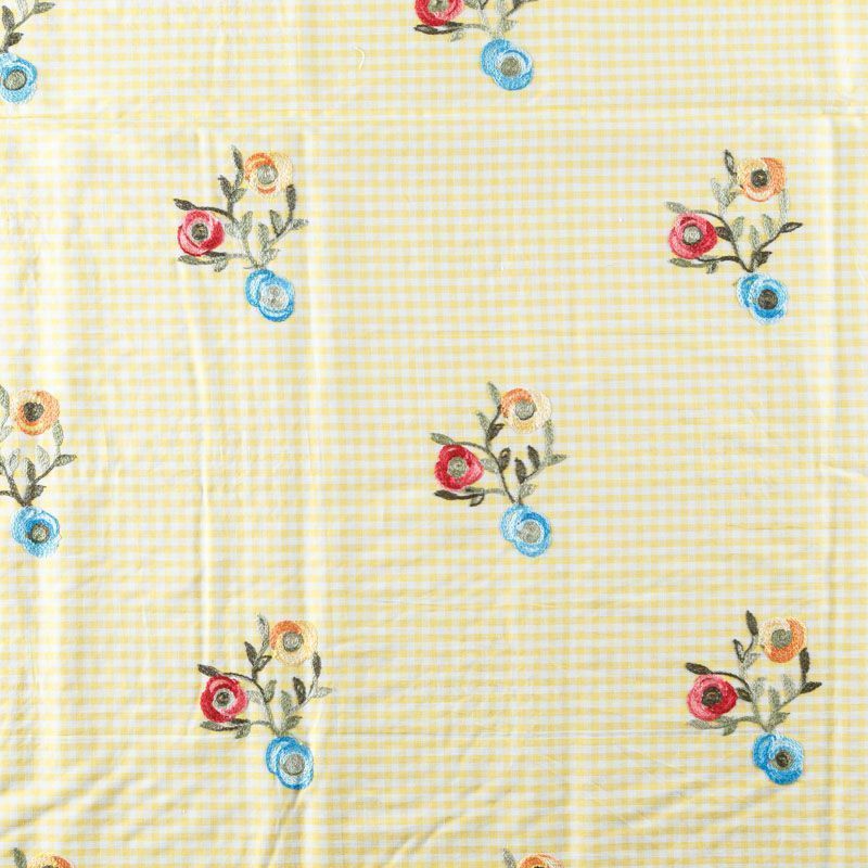 Плательно-блузочный хлопок в мелкую желто-белую клеточку декорирован яркой цветочной вышивкой. Полотно средней плотности, слегка просвечивает, очень нежное и пластичное, держит форму. Материал отлично драпируется, формируя мягкие складки. Подойдет для прямых, полуприлегающих, расклешенных моделей платьев, сарафанов, а также юбки, туники, платье-рубашки.