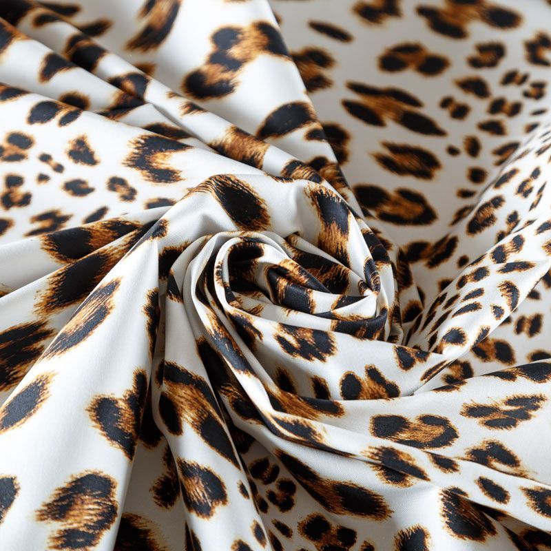 Итальянский коттон белого цвета с анималистическим принтом в природных оттенках. Поверхность гладкая, матовая, ткань средней плотности,  не толстая, хорошо держит форму, тянется за счет эластана в составе. Подойдет для пошива костюма, жакета, юбки, платья, брюк или шорт.