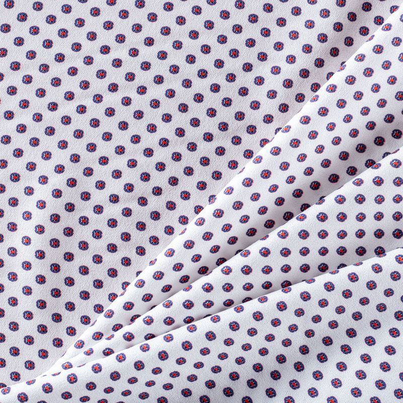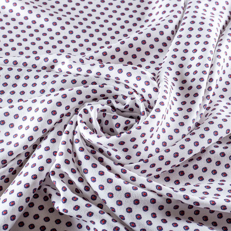 Натуральная вискозная ткань белого оттенка с цветным геометрическим мелким принтом. Легкая, хорошо тянется, драпируется струящимися складками, приятная и комфортная в носке. Материал слегка мнется имеет креповую фактуру. Идеально подходит для пошива  платьев, юбок, блуз, комбинезонов.