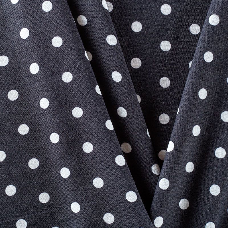 Плательный креп с принтом в горох. Ткань средней плотности, не толстая, пластичная, поверхность полотна матовая, с характерной мелкозернистой фактурой, прочная, хорошо драпирующаяся. Превосходно подойдет для пошива стильного костюма, юбки, платья, комбинезона, топа, брюк.
