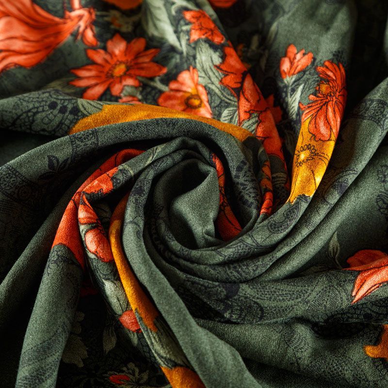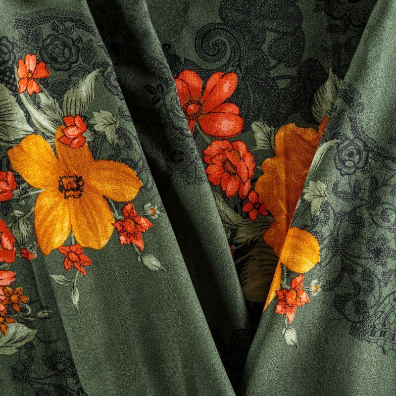 Плательно-блузочная вискозная ткань в холодном темно-зеленом оттенке с крупным цветочным принтом с креповым плетением. Ткань средней плотности, имеет зернистую фактуру и матовую поверхность, не просвечивает, пластичная, хорошо драпируется мягкими складками, струится. Подходит для пошива платья и сарафана, юбки, блузки, туники, топа, комбинезона.