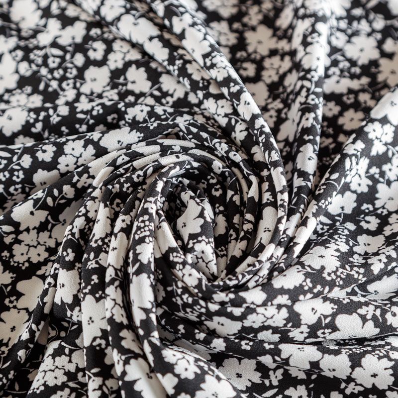 Плательный креп с трендовым уже не первый сезон мелкоцветным принтом на черном фоне, приятный и комфортный в носке, не мнется и не прозрачен на свету, имеет мелкозернистую матовую поверхность, тянется за счет эластана в составе. Идеально подойдет для пошива платья, юбки, широких брюк, комбинезона, блузки, топа или туники.