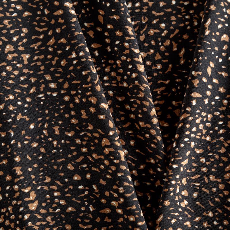 Плательный креп со стилизованным анималистическим принтом на черном фоне, приятный и комфортный в носке, не мнется и не прозрачен на свету, имеет мелкозернистую матовую поверхность, тянется за счет эластана в составе. Идеально подойдет для пошива платья, юбки, широких брюк, комбинезона, блузки, топа или туники.