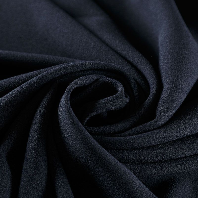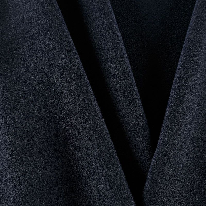 Итальянский вискозный креп костюмно-плательной плотности в черном цвете. Ткань имеет зернистую фактуру и матовую поверхность, не просвечивает, пластичная, хорошо драпируется мягкими складками, держит форму. Подходит для пошива костюма, платья, сарафана, юбки брюк, шорт, комбинезона.