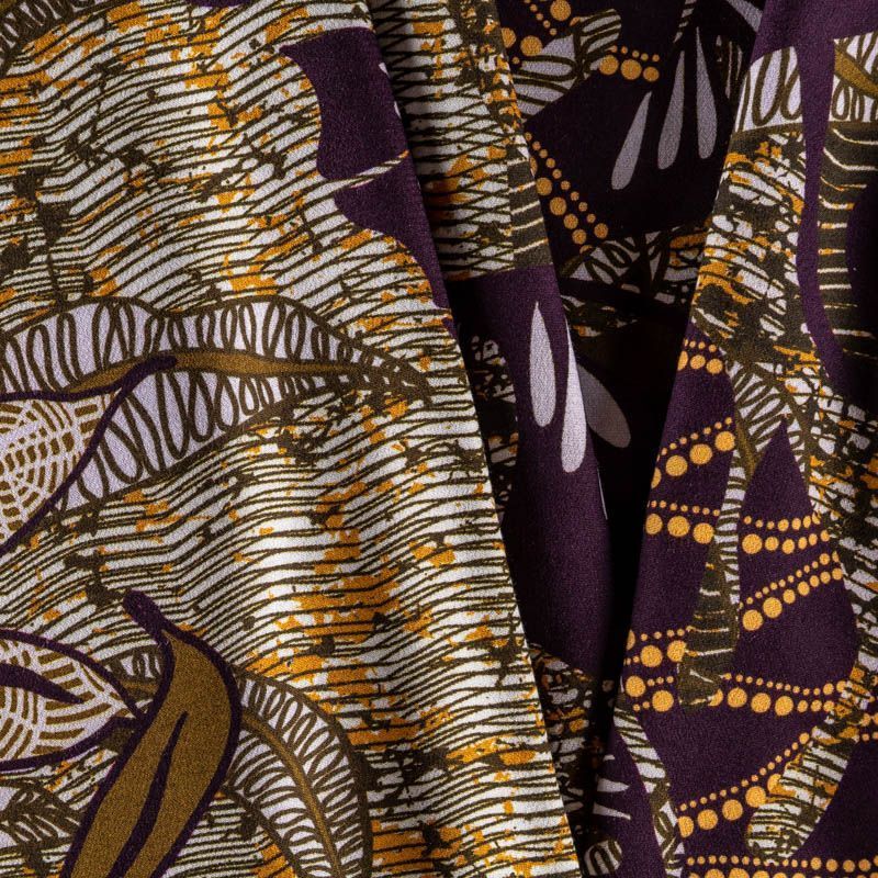 Натуральная вискозная ткань с абстрактным принтом в желто-болотных оттенках. Легкая, хорошо тянется, драпируется струящимися складками, приятная и комфортная в носке. Идеально подходит для пошива платьев, юбок, блуз, комбинезонов. Материал слегка мнется и прозрачен на свету, имеет креповую фактуру.
