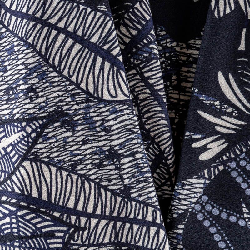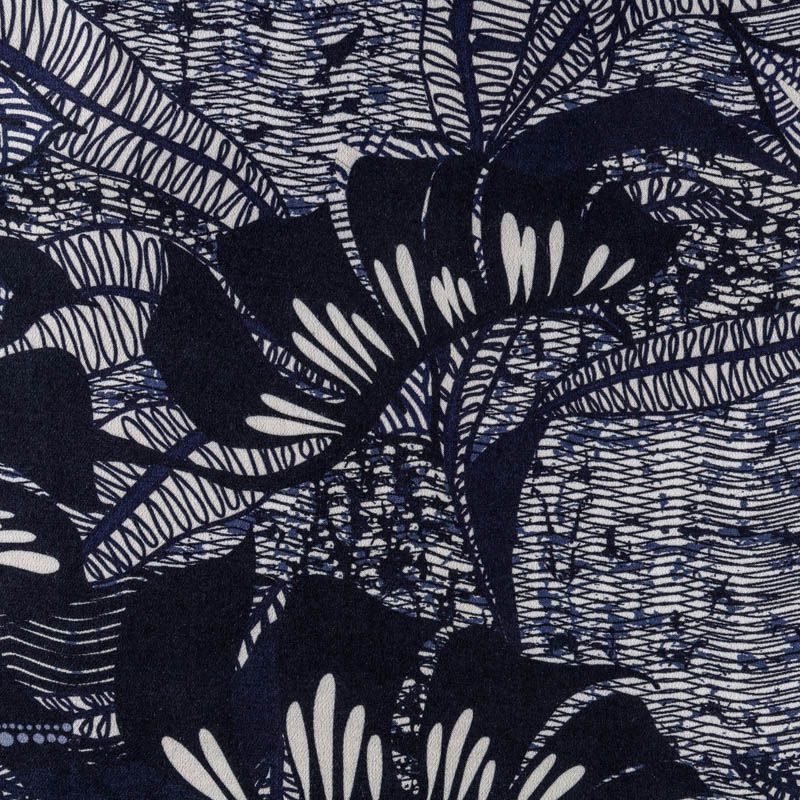 Натуральная вискозная ткань с абстрактным принтом в синих оттенках. Легкая, хорошо тянется, драпируется струящимися складками, приятная и комфортная в носке. Идеально подходит для пошива  платьев, юбок, блуз, комбинезонов. Материал слегка мнется и прозрачен на свету, имеет креповую фактуру.