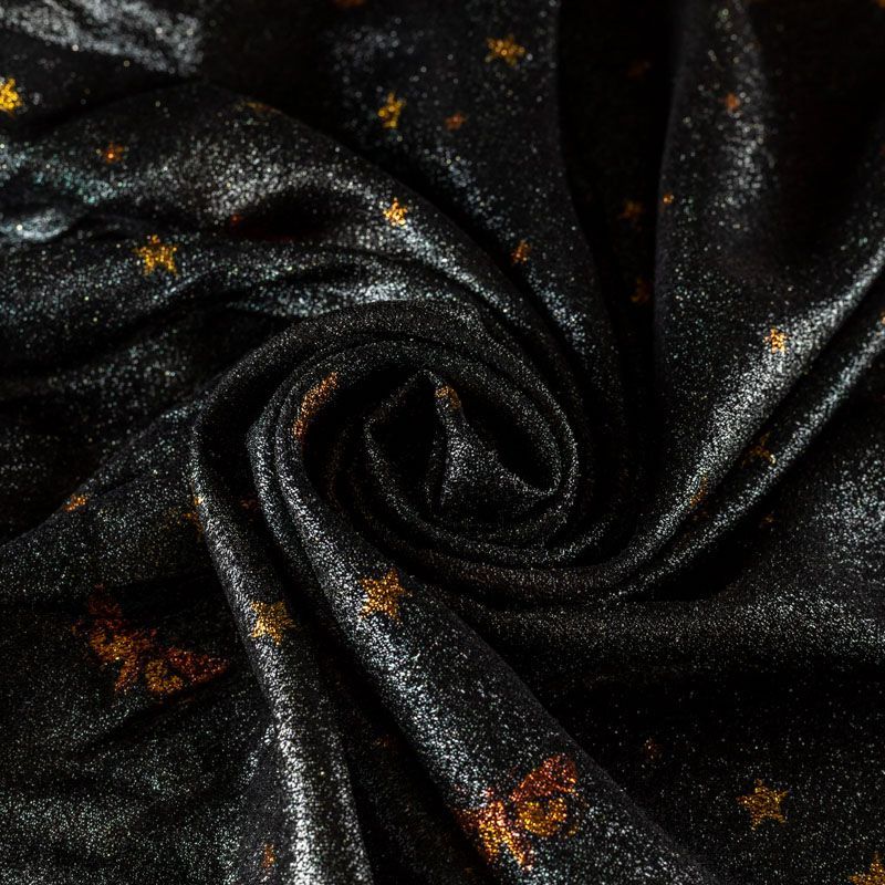 Шелковый креп-шифон черного цвета, полностью расшитый черно-золотой люрексовой нитью с фантазийным принтом. Не просвечивает, тянется, шикарно смотрится в драпировке. Подойдет для пошива платья, комбинезона, топа, блузки, свободных брюк.