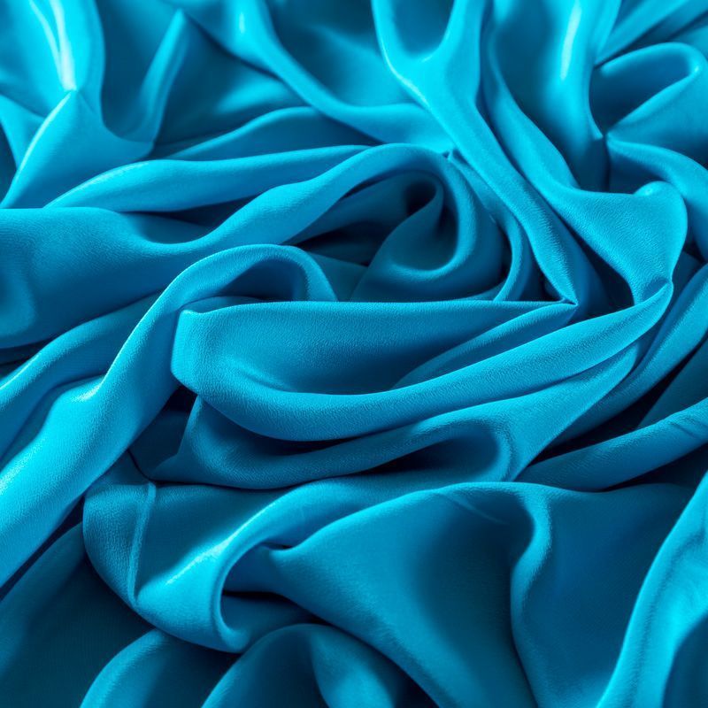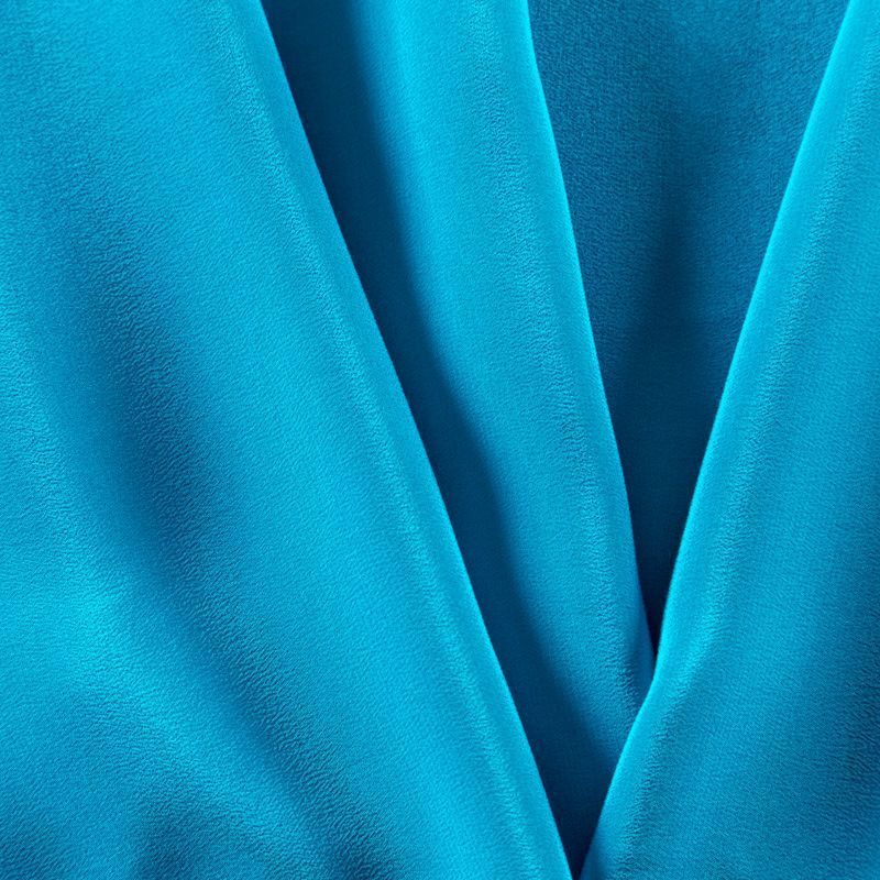 Итальянский натуральный шелковый крепдешин в бирюзовом оттенке, фактурный, легкий и струящийся, слегка просвечивает, отлично драпируется, тянется за счет эластана в составе. Идеально подойдет для пошива платьев и сарафанов расклешенных моделей, с воланами, летящих юбок, топов, блузки, юбки, широких брюк, костюма в пижамном стиле.