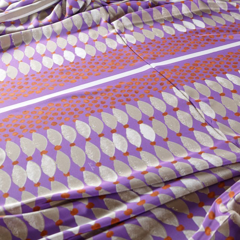 Итальянский натуральный купонный крепдешин с абстрактным принтом на фоне лавандового оттенка, тонкий, слегка прозрачный, отлично драпируется, легкий и струящийся с креповой поверхностью. Идеально подойдет для пошива платьев и сарафанов расклешенных моделей, с воланами, летящих юбок, топов, блузки, костюма в пижамном стиле.