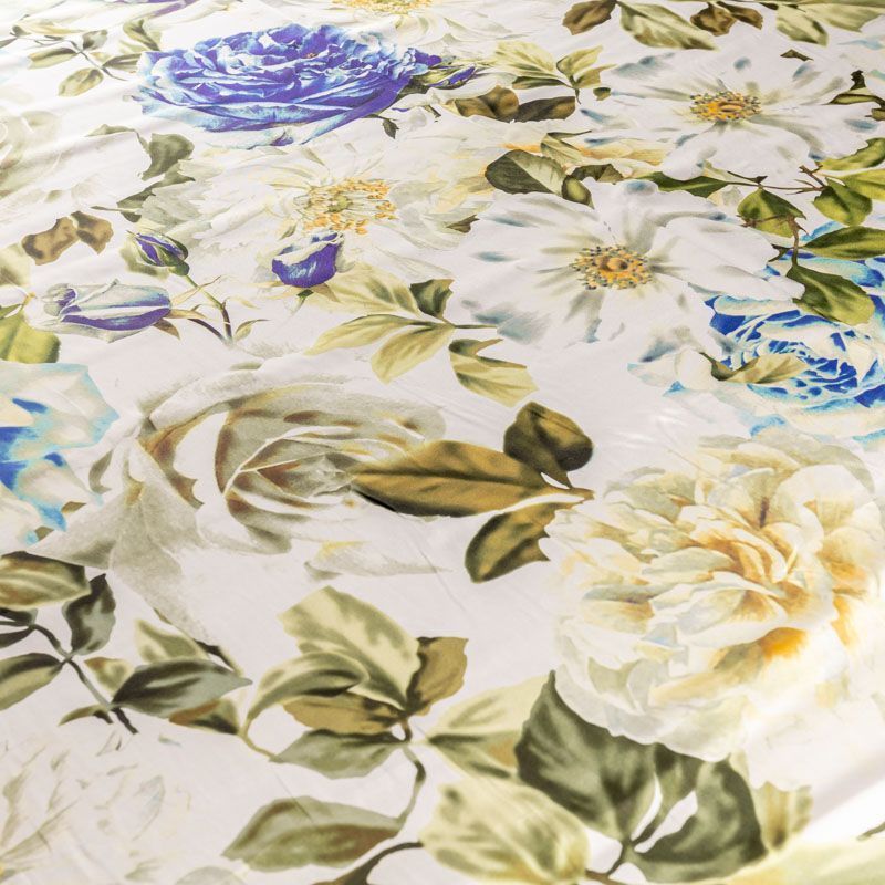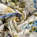 Натуральный шелковый крепдешин с матовой поверхностью, легкий, струящийся, хорошо драпируется. Цветочный принт в сине-зеленых оттенкам будет уместен для пошива летнего сарафана, платья, блузки, костюма в пижамном стиле, широких брюк или юбки.