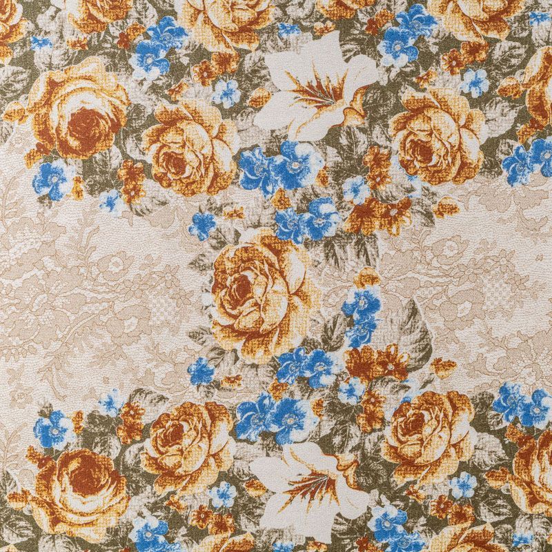 Натуральный шелковый крепдешин с матовой поверхностью, легкий, струящийся, хорошо драпируется. Изысканное сочетание цветочного принта в коричнево-синих оттенках с имитацией нежного тонкого кружева подойдет для пошива летнего сарафана, платья, блузки, костюма в пижамном стиле, широких брюк или юбки.