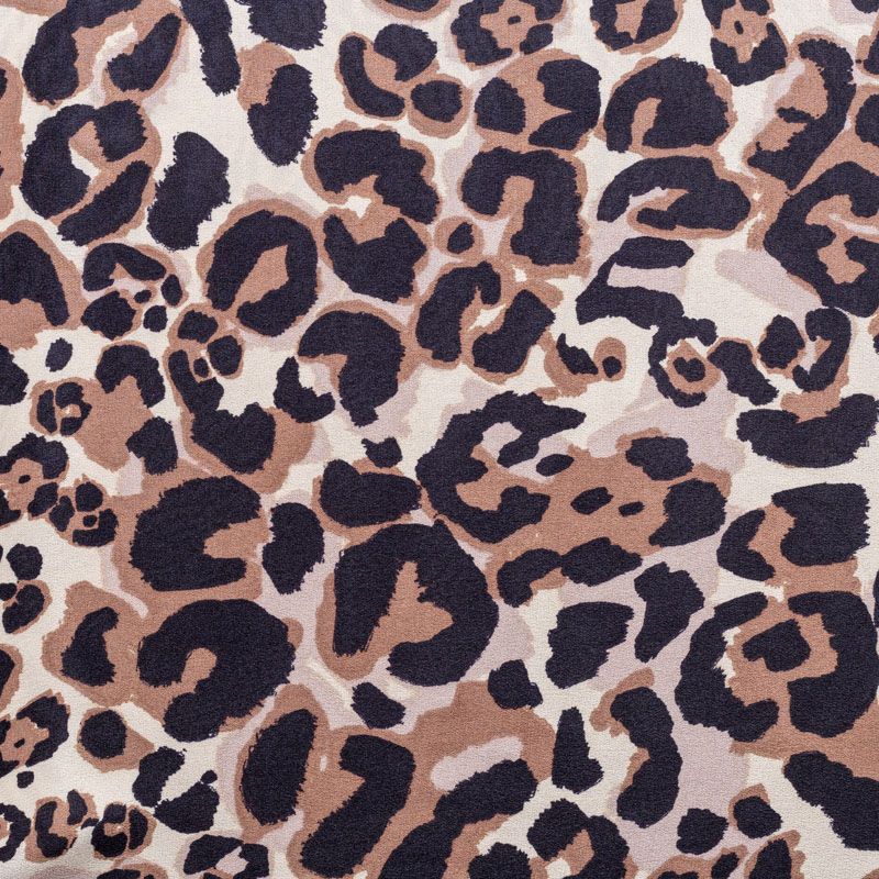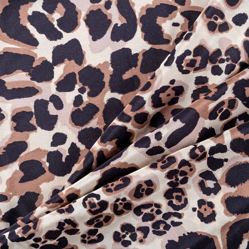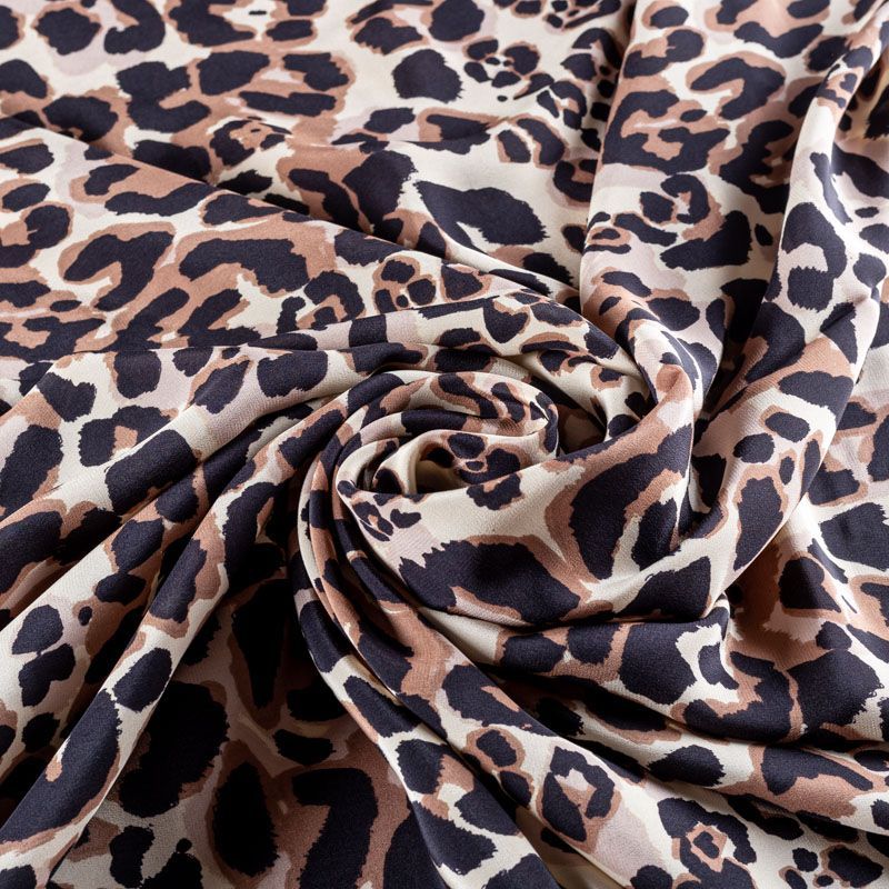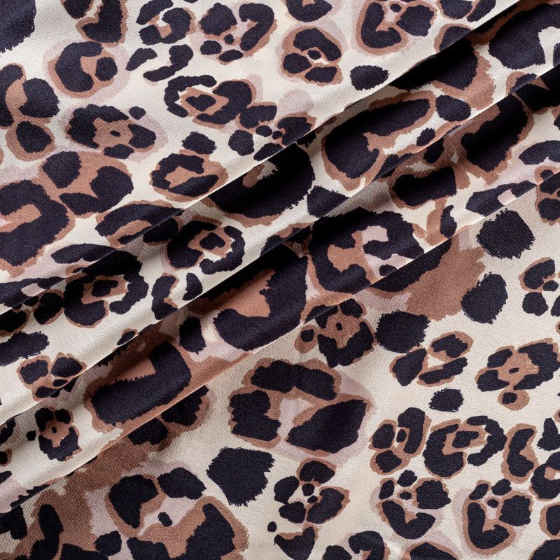Итальянский крепдешин с матовой лицевой поверхностью с "хищным" принтом на молочном фоне, тонкий, слегка прозрачный, отлично драпируется, легкий и струящийся. Идеально подойдет для пошива платьев и сарафанов свободных силуэтов, с воланами, летящих юбок, топов, блузки, костюма в пижамном стиле.