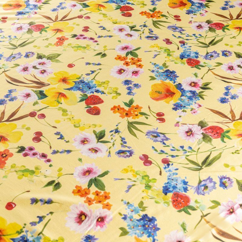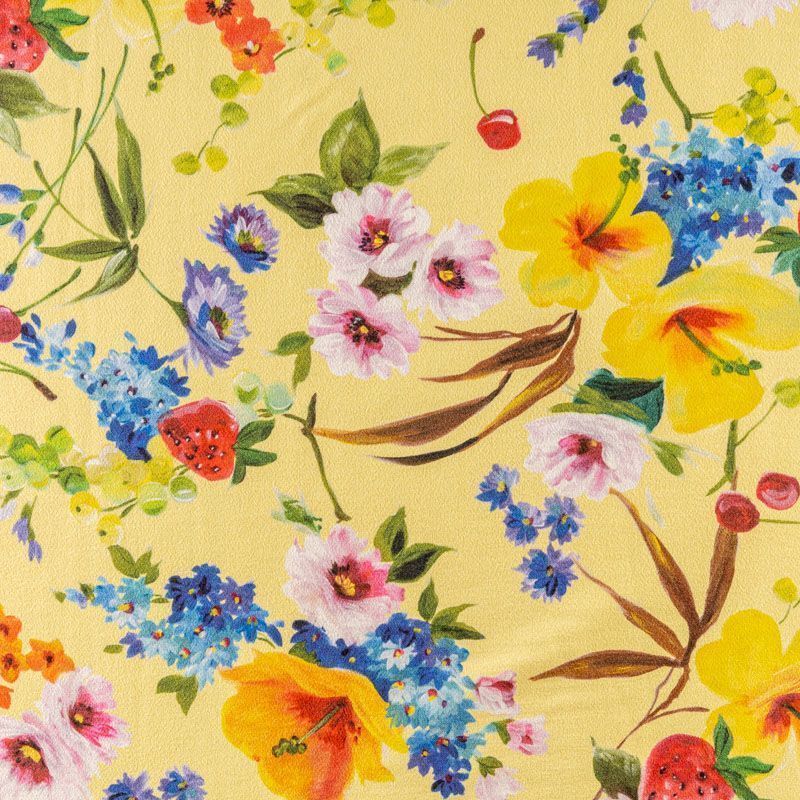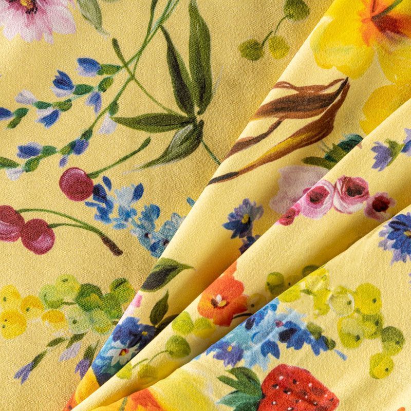 Натуральный шелковый крепдешин с добавлением хлопка с матовой поверхностью, легкий, струящийся, хорошо драпируется. Ткань немного просвечивает, хорошо тянется за счет эластана в составе. Яркий ягодно-цветочный принт на актуальном в этом сезоне желтом фоне прекрасно подойдет для пошива летнего сарафана, платья, блузки, костюма в пижамном стиле, широких брюк или юбки.