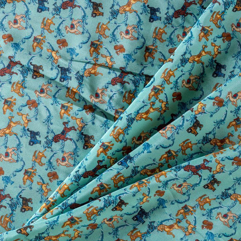 Натуральный шелковый крепдешин с матовой поверхностью, легкий, струящийся, хорошо драпируется. Стилизованный анималистический принт выполнен бежево-коричневой гамме на фоне бирюзового оттенка. Крепдешин прекрасно подойдет для пошива летнего сарафана, платья, блузки, костюма в пижамном стиле, широких брюк или юбки.