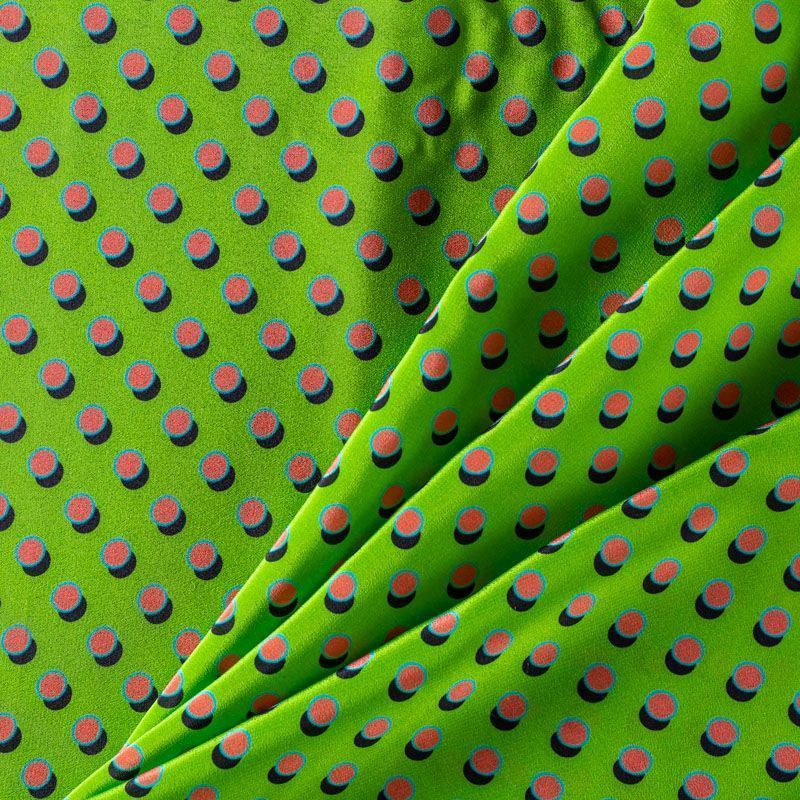 Натуральный шелковый крепдешин с матовой поверхностью, легкий, струящийся, хорошо драпируется, не просвечивает. Универсальный принт выполнен в ярких оттенках, который прекрасно подойдет для пошива летнего сарафана, платья, блузки, костюма в пижамном стиле, широких брюк или юбки.