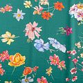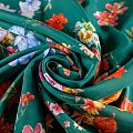 Итальянский крепдешин с матовой лицевой поверхностью с цветочным принтом на зеленом фоне, тонкий, слегка прозрачный, отлично драпируется, легкий и струящийся. Идеально подойдет для пошива платьев и сарафанов расклешенных моделей, с воланами, летящих юбок, топов, блузки, костюма в пижамном стиле.