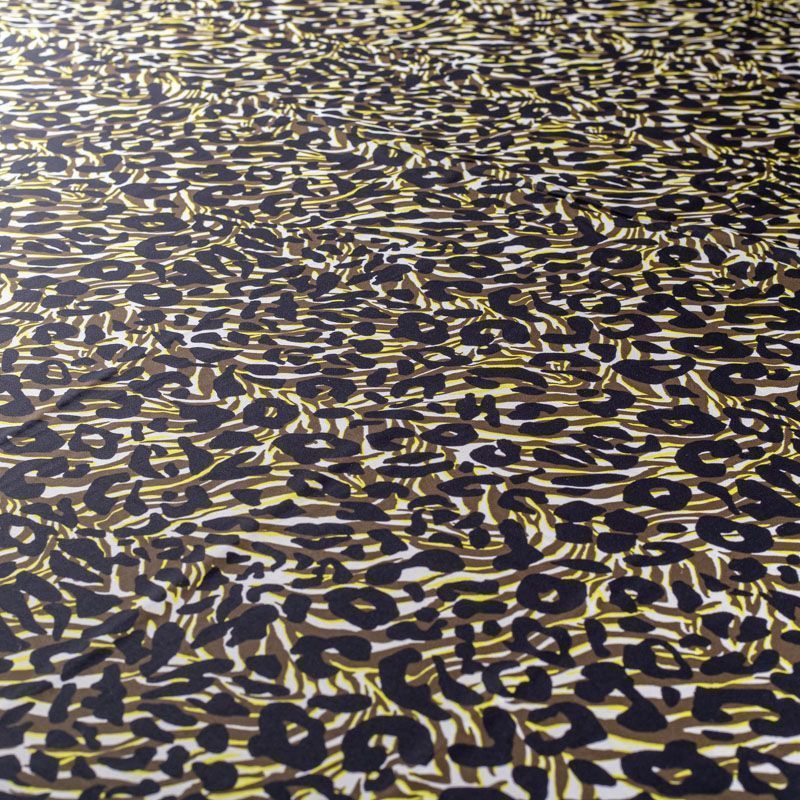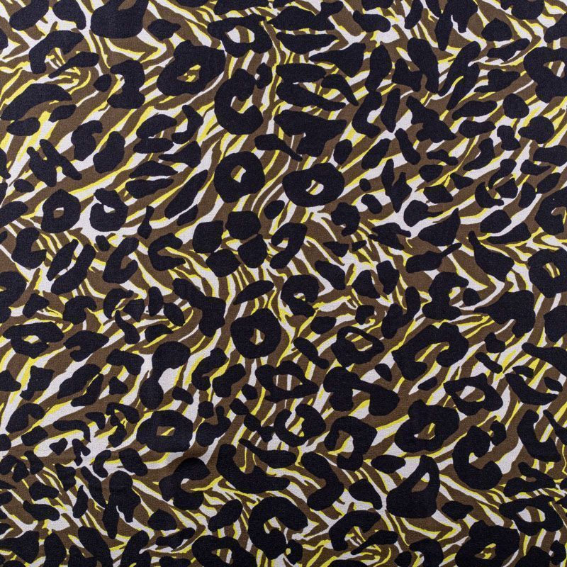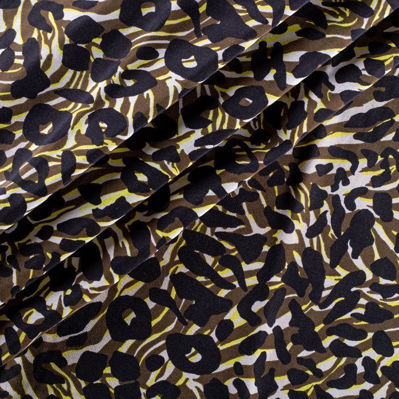 Натуральный шелковый крепдешин с матовой поверхностью, легкий, струящийся, хорошо драпируется. Сочетание анималистического и "милитари" принтов прекрасно подойдет для пошива летнего сарафана, платья-рубашки, топа, блузки, костюма в пижамном стиле, широких брюк, комбинезона или юбки.