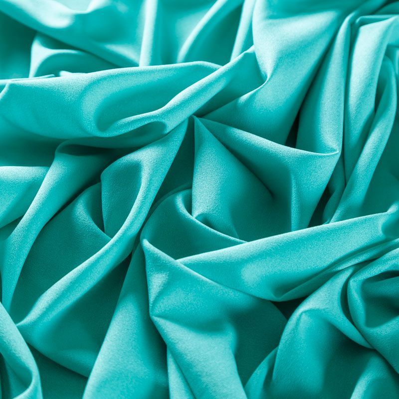 Крепдешин мятно-бирюзового оттенка, тонкий, легкий, фактурный, приятный на ощупь. Очень пластичный, тянется за счет эластана в составе, прекрасно драпируется и струится. Ткань слегка просвечивает, можно использовать подклад. Идеально будет смотреться в платье, юбке, тунике, рубашке или блузке.