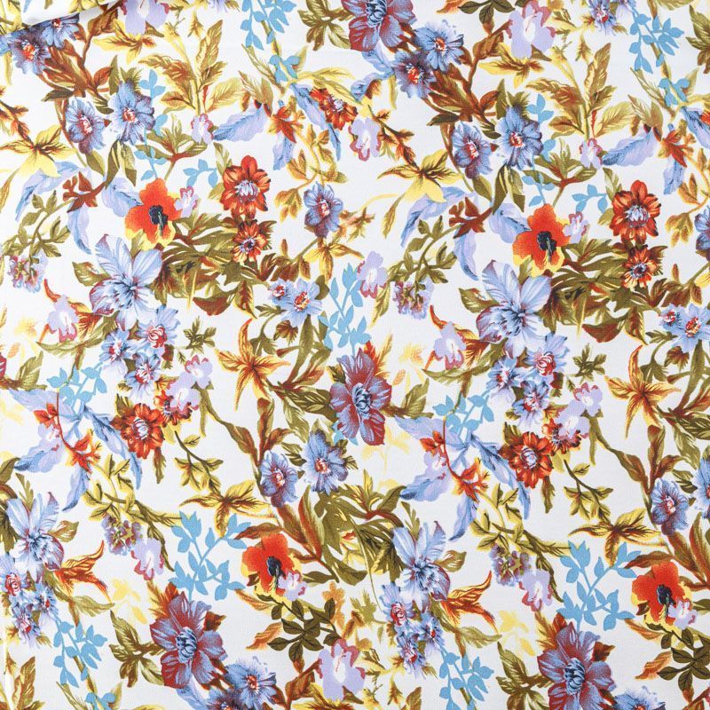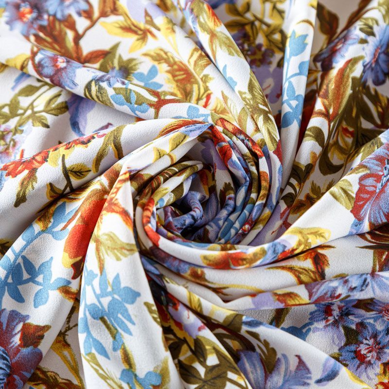 Крепдешин с цветочным летним принтом, тонкий, легкий, фактурный, приятный на ощупь. Очень пластичный, тянется за счет эластана в составе, прекрасно драпируется и струится. Ткань слегка просвечивает, можно использовать подклад. Идеально будет смотреться в платье, юбке, тунике, рубашке или блузке.