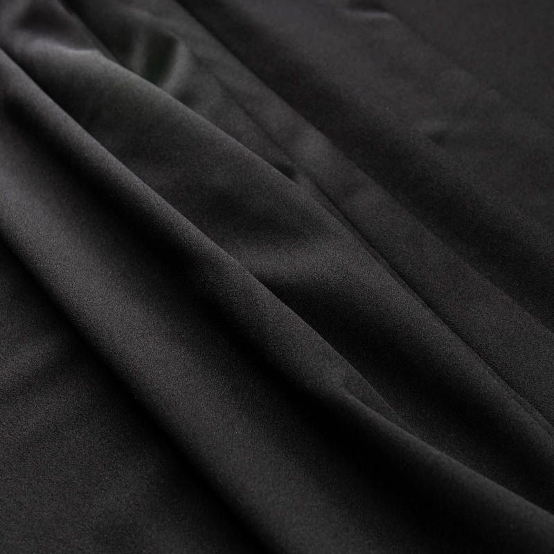 Крепдешин глубокого черного цвета, тонкий, легкий, фактурный, приятный на ощупь. Очень пластичный, прекрасно драпируется и струится. Ткань слегка просвечивает, можно использовать подклад. Идеально будет смотреться в платье, юбке, тунике, рубашке или блузке.