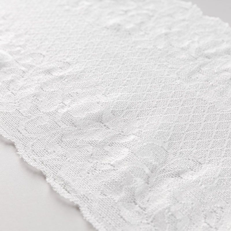 Эластичное кружево сочетает в себе мягкость, прочность и красоту, благодаря своей упругости оно долго не теряет первоначальную форму. Используется для пошива нижнего белья, а так же применяется как отделочный декор в одежде.