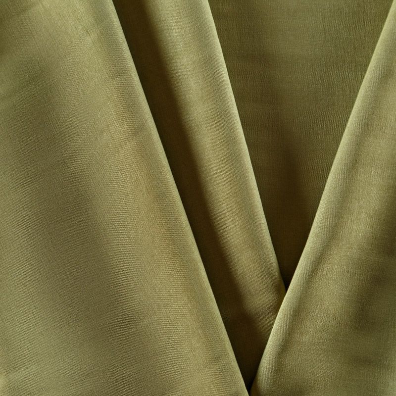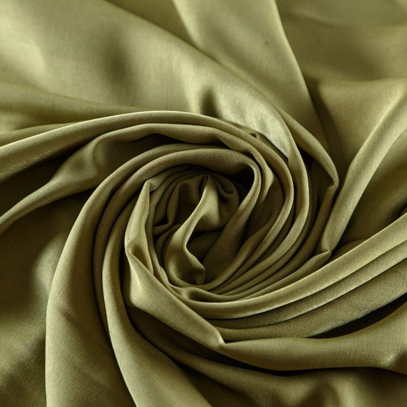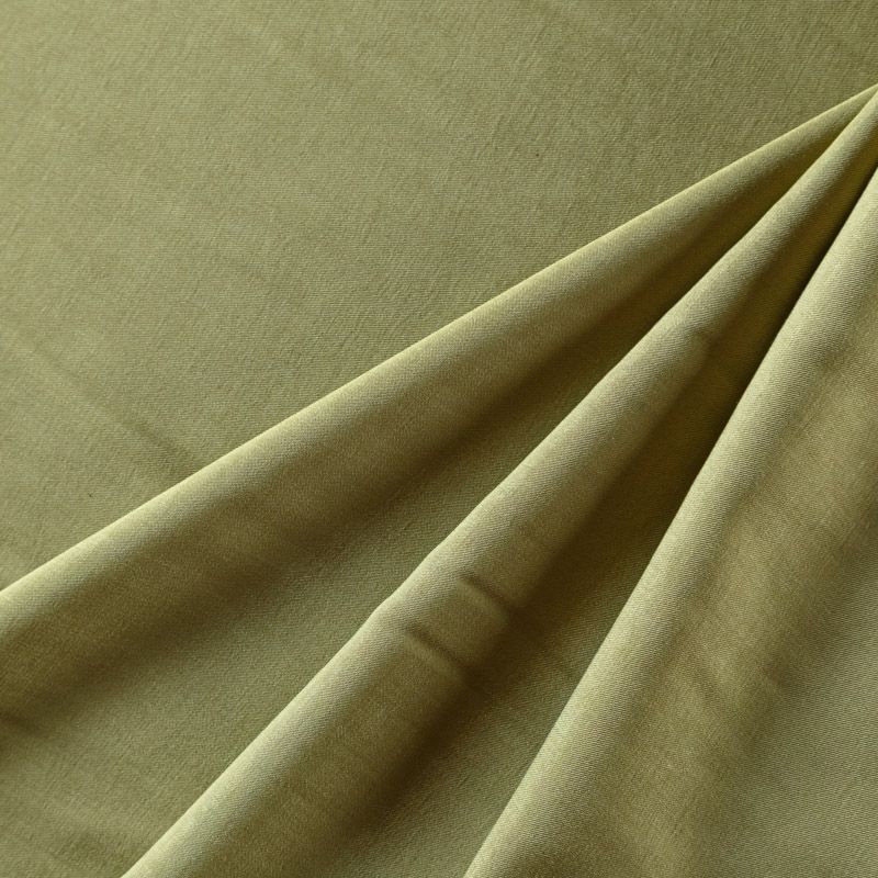Купро плательно-костюмной плотности желто-зеленого оттенка. Ткань мягкая, пластичная, струящаяся, отлично драпируется, не просвечивает. Поверхность ткани бархатистая, похожа на мокрый шелк. Идеально подойдет для платьев свободного силуэта, брюк-палацио, юбок, шорт, туник, платья-рубашки, блузы.