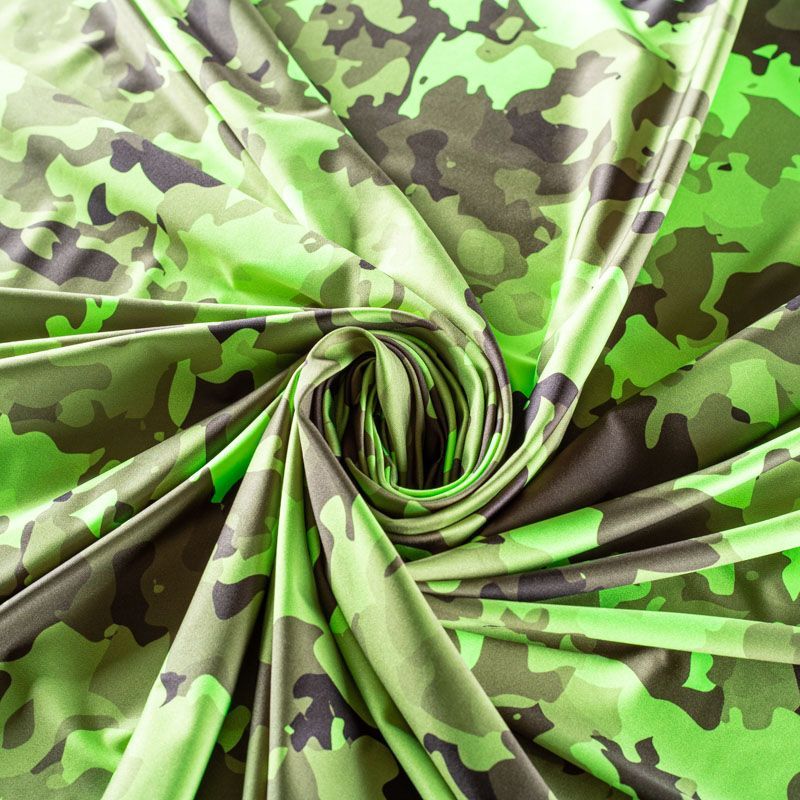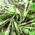 Итальянский бифлекс с камуфляжным принтом в зеленых оттенках. Поверхность ткани матовая и гладкая. Отлично тянется, одежда из него не сковывает движения. Хорошо впитывает влагу и быстро высыхает, не вызывет аллергии и раздражения. Используется для пошива эстрадных, спортивных костюмов, купальников, боди.