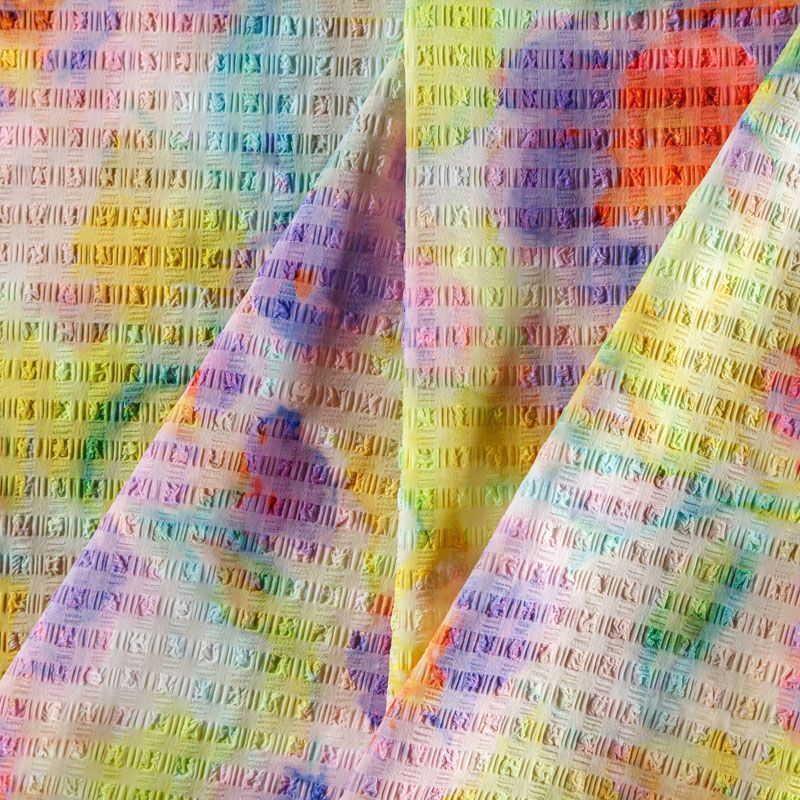 Итальяская качественная, красивая и приятная на ощупь лайкра желтого цвета в цветочным принтом в ярких оттенках. Поверхность ткани матовая, с жаккардовой фактурой и имитацией жатки. Идеально облегает фигуру, тянется по двум направлениям, хорошо драпируется, отлично держит форму, устойчива к пилингу, долговечна и гигроскопична. Используется для пошива одежды для танцев, гимнастики, фигурного катания, для велоспорта, легкой атлетики и аэробики, фитнеса и других видов спорта, для купальников, женского белья, театральных, цирковых и эстрадных костюмов.