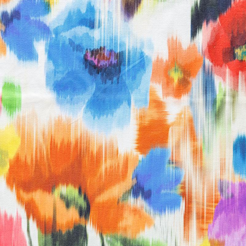 Итальяская качественная, красивая и приятная на ощупь лайкра белого цвета со стильым цветочным принтом. Идеально облегает фигуру, тянется по двум направлениям, хорошо драпируется, отлично держит форму, устойчива к пилингу, долговечна и гигроскопична. Используется для пошива одежды для танцев, гимнастики, фигурного катания, для велоспорта, легкой атлетики и аэробики, фитнеса и других видов спорта, для купальников, женского белья, театральных, цирковых и эстрадных костюмов.