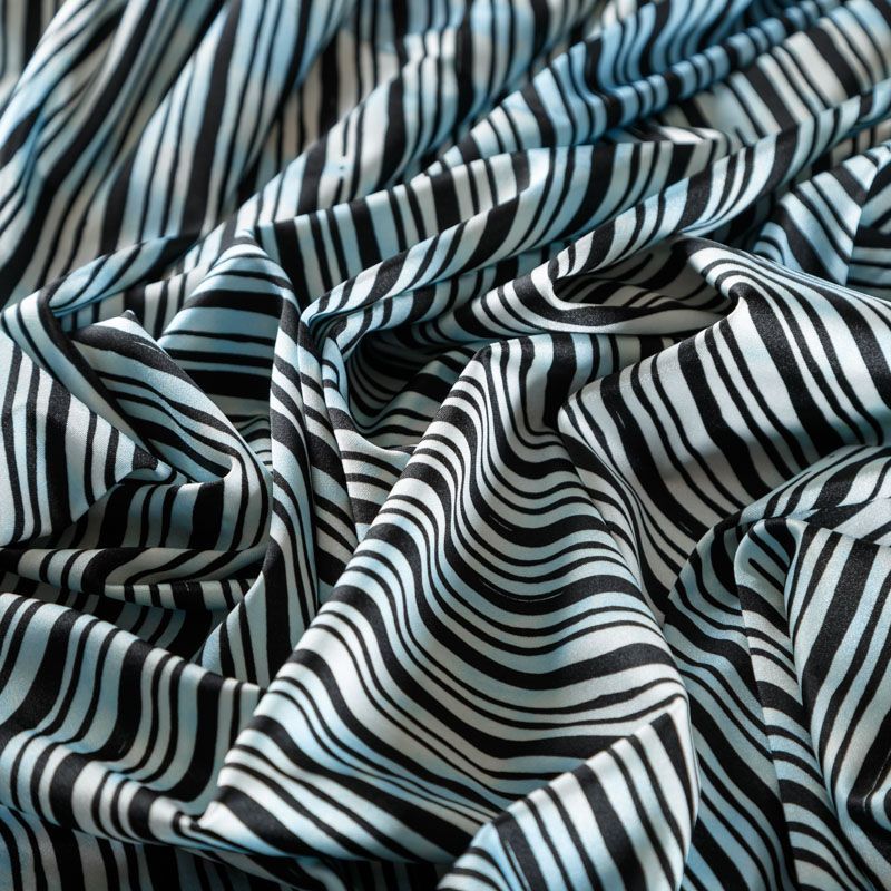 Итальяская качественная, красивая и приятная на ощупь лайкра белого цвета с принтом тай-дай и черной диагональной полоской. Поверхность ткани матовая и гладкая. Идеально облегает фигуру, тянется по двум направлениям, хорошо драпируется, отлично держит форму, устойчива к пилингу, долговечна и гигроскопична. Используется для пошива одежды для танцев, гимнастики, фигурного катания, для велоспорта, легкой атлетики и аэробики, фитнеса и других видов спорта, для купальников, женского белья, театральных, цирковых и эстрадных костюмов.