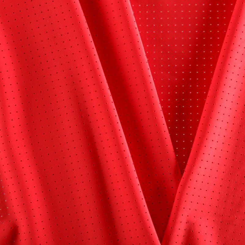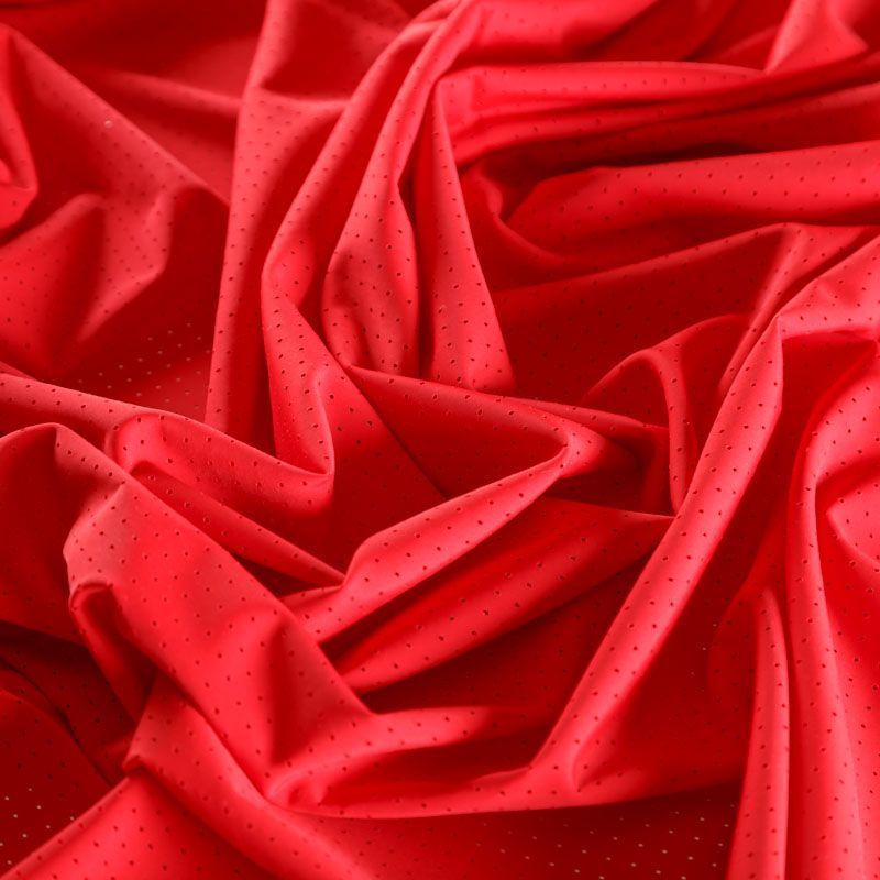 Итальяская качественная, красивая и приятная на ощупь лайкра с перфорацией красного оттенка. Поверхность ткани матовая, гладкая, шелковистая на ощупь. Идеально облегает фигуру, тянется по двум направлениям, хорошо драпируется, отлично держит форму, устойчива к пилингу, долговечна и гигроскопична. Используется для пошива одежды для танцев, гимнастики, фигурного катания, для велоспорта, легкой атлетики и аэробики, фитнеса и других видов спорта, для купальников, женского белья, театральных, цирковых и эстрадных костюмов.