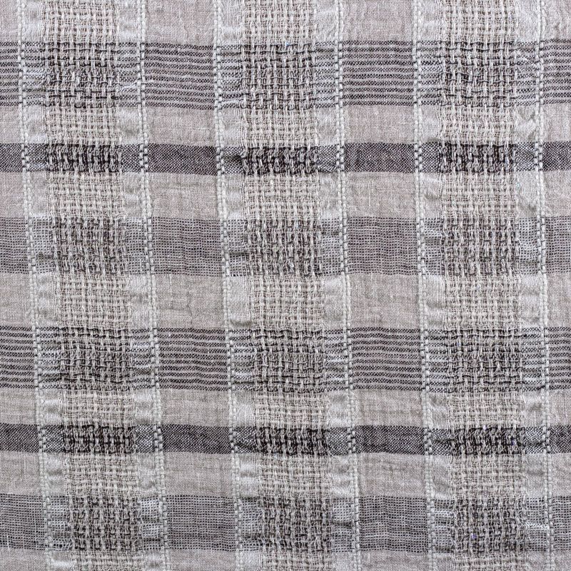 Итальянский лен с добавлением вискозы средней плотности со сложной "клетчатой" геометрией в черно-белых оттенках декорирован мелкими пайетками. Различная толщина нитей создает эффектную фактуру. Ткань пластичная, гибкая за счет плетения,  матовая, мягкая, приятная на ощупь, не рыхлая, комфортная в изделии. Отлично подойдет для пошива летних костюмов, рубашек, туник, платьев, сарафанов, юбок, жакетов, брюк или шорт, легкого пальто.