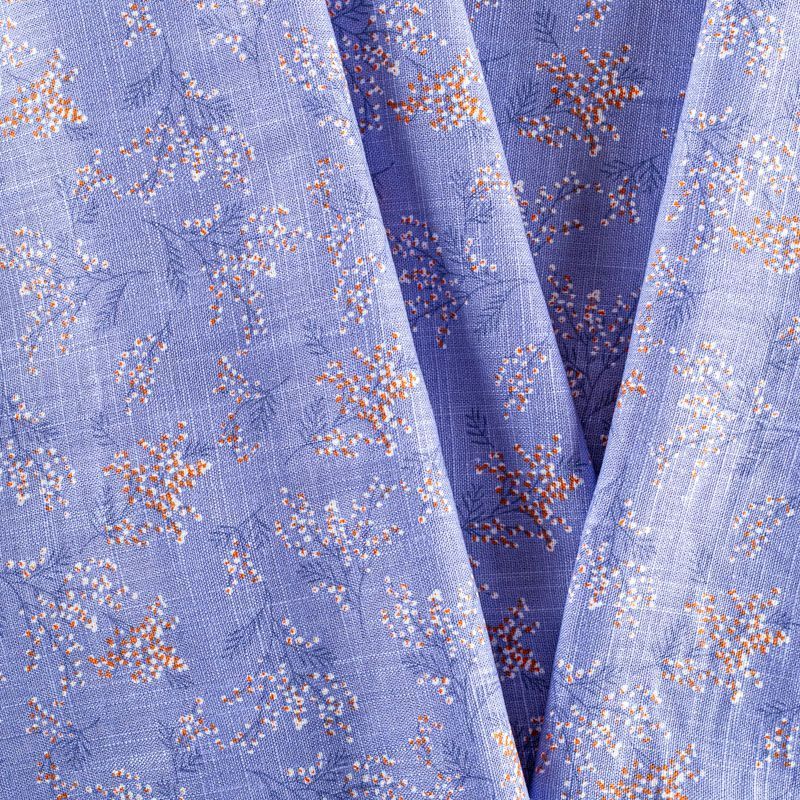 Льняная плательная ткань с добавлением вискозы оттенка лаванды с растительным принтом. Материал прочный, с выразительной матовой рельефной поверхностью, полотняным плетением, хорошо держит форму, мягкий на ощупь, пластичный, отлично драпируется. Прекрасно подойдет для пошива летних платьев, сарафанов, юбок, рубашек, брюк и шорт.