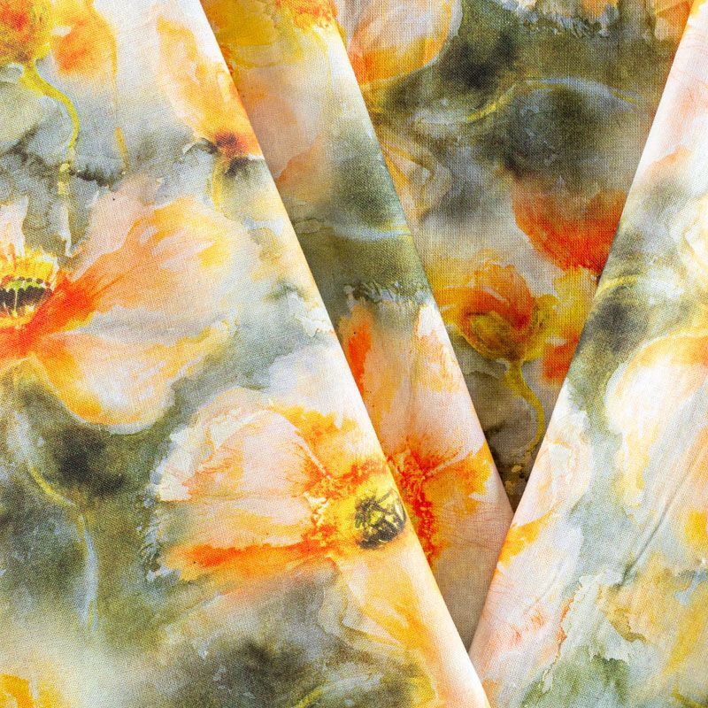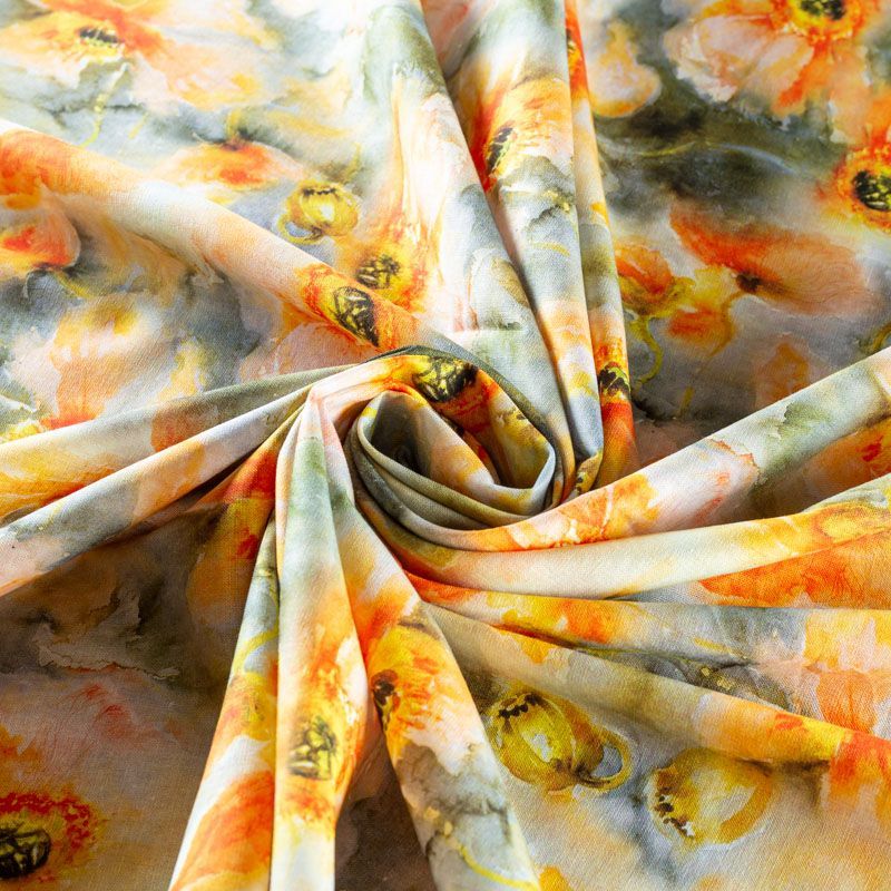 Льняная плательно-рубашечная ткань с добавлением бемерии в серых оттенках с ярким цветочным принтом, выполненным в акварельной технике. Материал прочный, с выразительной матовой рельефной поверхностью, полотняным плетением, хорошо держит форму, мягкий на ощупь, пластичный, отлично драпируется. Прекрасно подойдет для пошива летних платьев, сарафанов, юбок, рубашек, брюк и шорт.